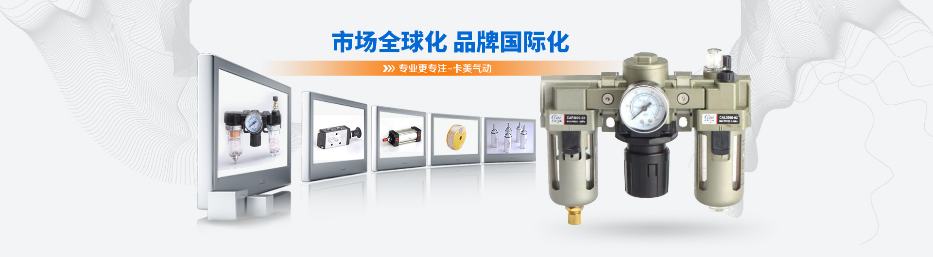 卡美氣動有限公司是一家具有現代化生產規模的專業開發、制造氣動元件的公司。主導產品有:氣源處理系列、標準缸、迷你缸、超薄缸、QGB(大直徑)氣缸、雙軸缸、電磁閥、氣動閥、油壓缸、快速接頭、PU氣管等產品。